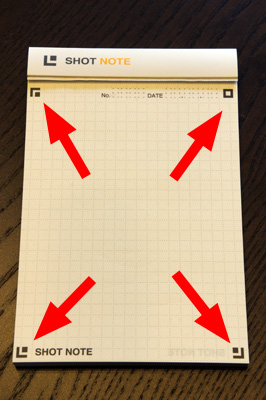 仕掛けとしては、メモ用紙の四隅にあるマーカーがあって、iPhoneアプリ側でメモを撮影するときにファインダーに表示されるマーカーエリアに合わせて写真を撮れば傾きなどのひずみを勝手に修正してくれる。