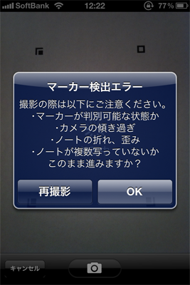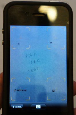 これ、どう便利かというと、フレームさえ作っておけばその中に別紙に書いたメモなど、いろんなものを枠内に入れて撮影出来ちゃう!結構使えそうなのである。会社のデスクにマーカーフレームを印刷した紙だけ置いておいて、後は名刺やら手書きメモをその上に乗せてパシャリ。うーん夢が広がるw。